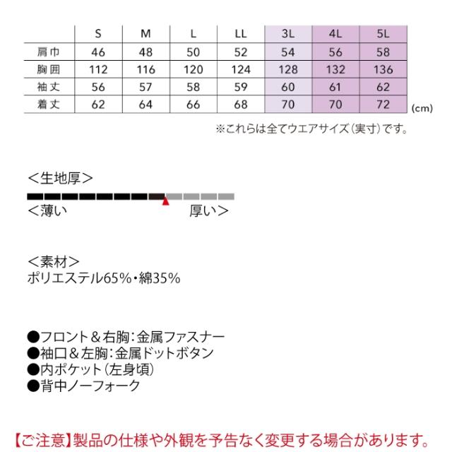 ◇フロントと右旨:金属ファスナー・袖口と左胸:金属ドットボタン・内ポケット(左身頃)・背中ノーフォーク