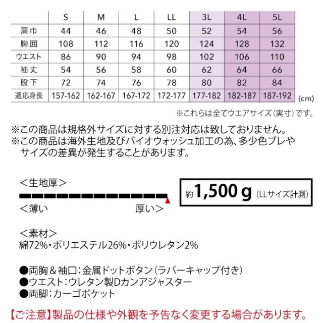 ◇両胸と袖口:金属ドットボタン(ラバーキャップ付き)・ウエスト:ウレタン製Dカンアジャスター・両脚:カーゴポケット