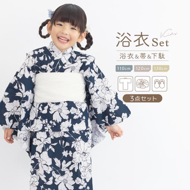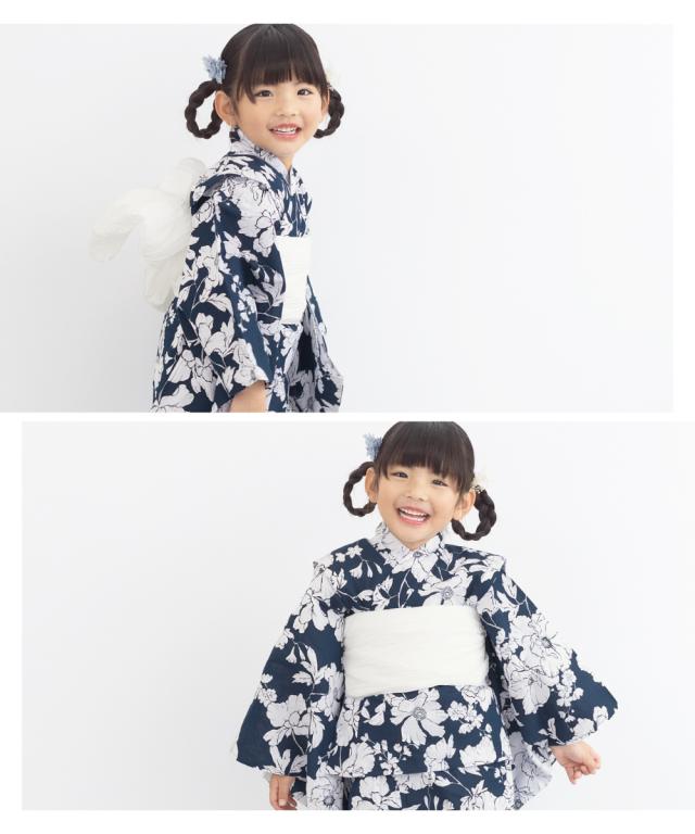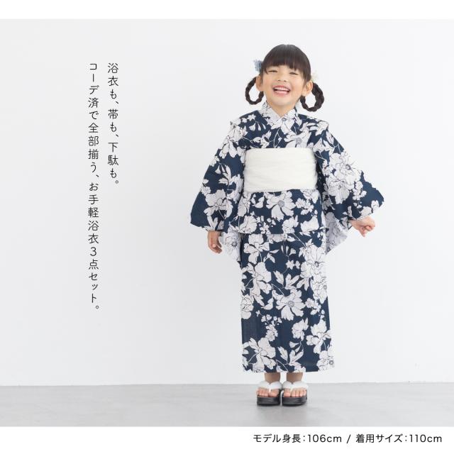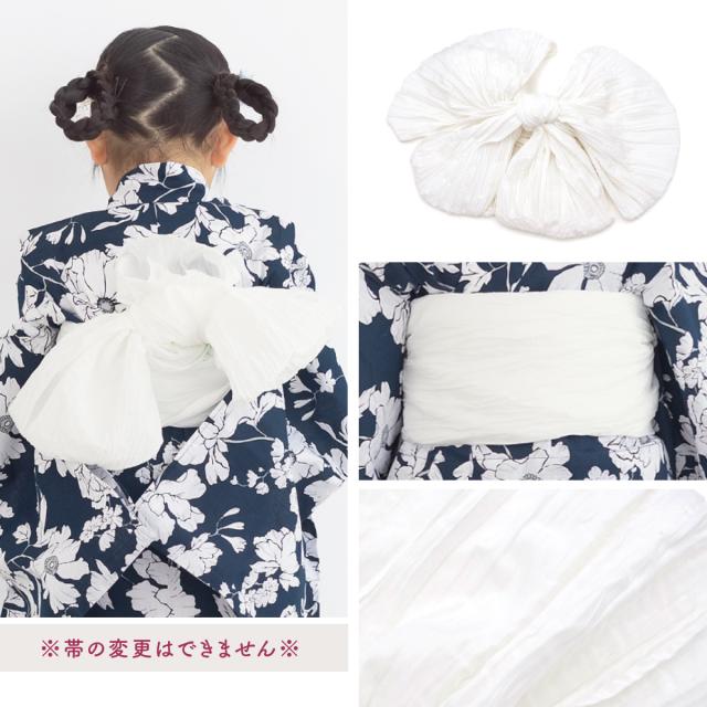 浴衣 女の子 浴衣セット キッズ 子供 兵児帯 3点セット モダン ネイビー 白 ポピー 花火 花柄 帯 夏 祭 送料無料