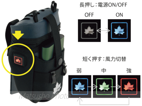 人気の野電 ボディエアコンシリーズからお手軽に使えるLOGOSボディエアコンシリーズ最小モデルが登場。使い方はお手持ちのベルトに巻いて服に被せるだけの簡単装着。さらに付属のストラップで首掛けや肩掛けもできるポーチタイプです。シリーズ初のファンカバー構造採用により衣類や雨の吸い込みも解消。別売りの氷点下パック コンパクトと組み合わせればひんやり冷たい風が身体を冷やしてくれます。■総重量約140g■サイズ約幅11×奥行9×高さ19cm■モード:弱/中/強■作動時間約[強]8時間[中]11時間[弱]22時間■冷風持続時間約30分(氷点下パック使用時)■電源:USB■入力電圧/電流5V/2A※本品にモバイルバッテリーは付属していません。使用するモバイルバッテリーは本品の入力電圧/電流に対応する物をご使用下さい。1A未満でも給電できる物を使用して下さい。使用モードにより動作電流が1Aを下回る場合があり誤作動を招いたり作動しません。記載の規格で必ずご使用頂ける事をお約束するものではありません。氷点下パックによる冷風効果の持続時間は使用環境等により異なります。