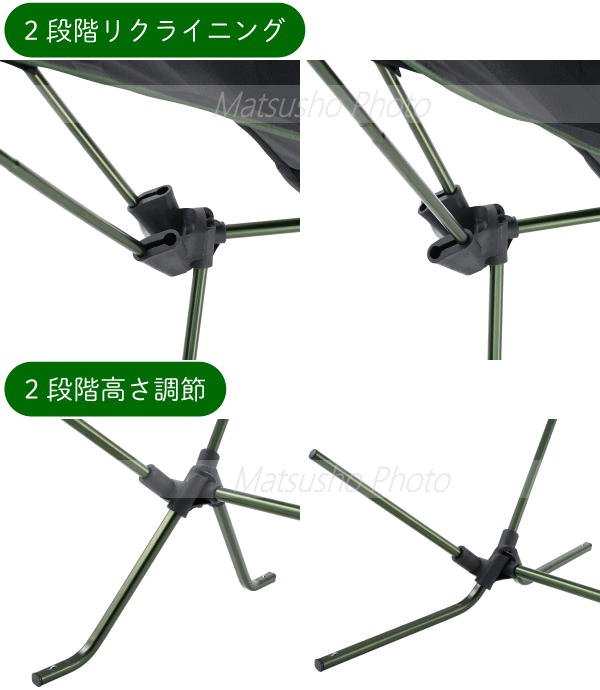 長時間座っていても疲れにくいヘッドレスト付き&ハイバック仕様に加えてリクライニングと高さがそれぞれ2段階に調節可能なチェア。この1脚で4パターンの座り方ができるため食事シーンからリラックスタイムまで幅広いシーンで活躍します。スマートフォンやちょっとした小物等を入れるのに便利なサイドポケットとペットボトルや缶飲料が入るドリンクホルダー付き。優れた強度と軽さを兼ね備えた7075超々ジュラルミンを主要フレームに採用。コンパクトに収納でき持ち運びに便利な収納バッグ付。■総重量約2.0kg■サイズ[ハイスタイル]約高96×幅59×奥行71cm(座高42cm)[ロースタイル]約高82×幅63.5×奥行72cm(座高29cm)[ハイ&リクライニング]約高88×幅59×奥行91cm(座高43cm)[ロー&リクライニング]約高74×幅59×奥行91cm(座高29cm)■収納サイズ約縦13×横15×長さ55cm■耐荷重約120kg■構成:本体、脚キャップ×4、収納バッグ■主素材:7075超々ジュラルミン、ポリエステル(PVCコーティング)※耐荷重表記は静止荷重による目安です。