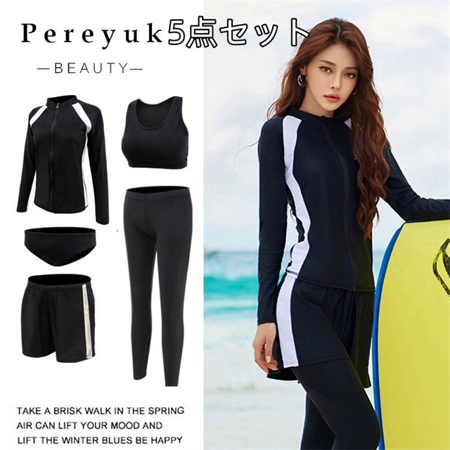 【女性用・5点セット】ラッシュガード+ ショートパンツ+タンクトップ+ショーツ+レギンス