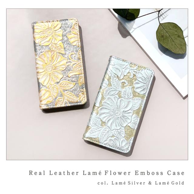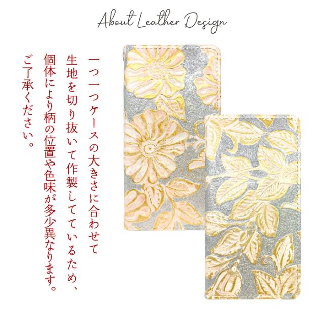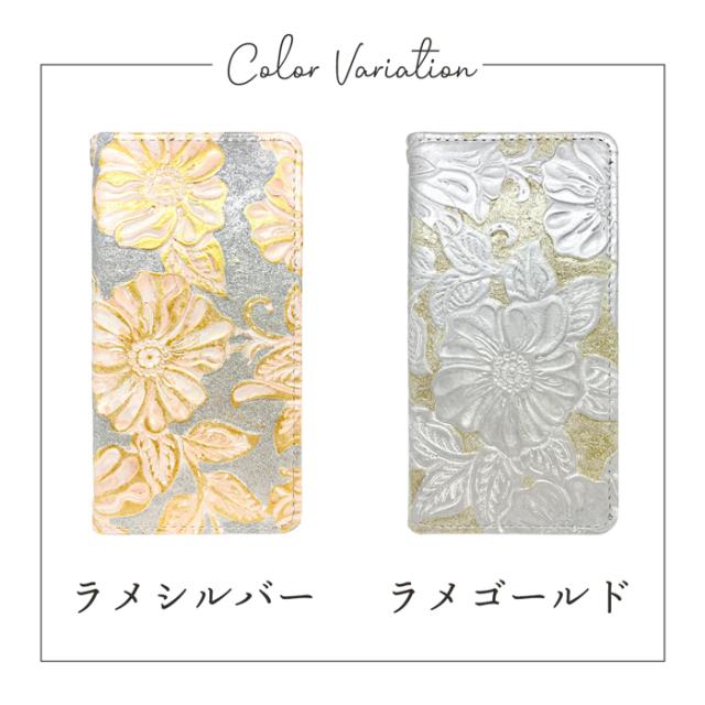 本革 ラメフラワー 型押し 手帳型ケース(内側:黒TPU ケース)