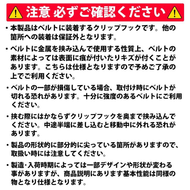・本製品はベルトに装着するクリップフックです。他の箇所への装着は保証外となります。