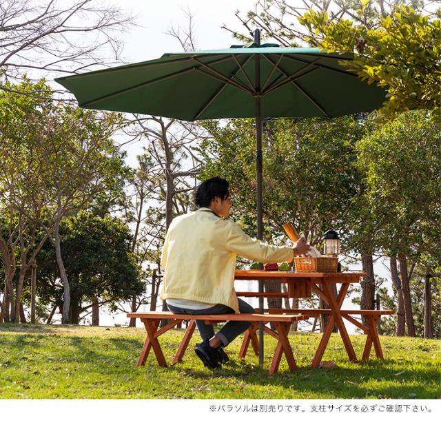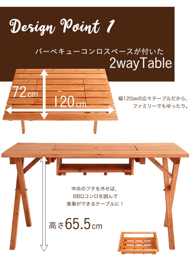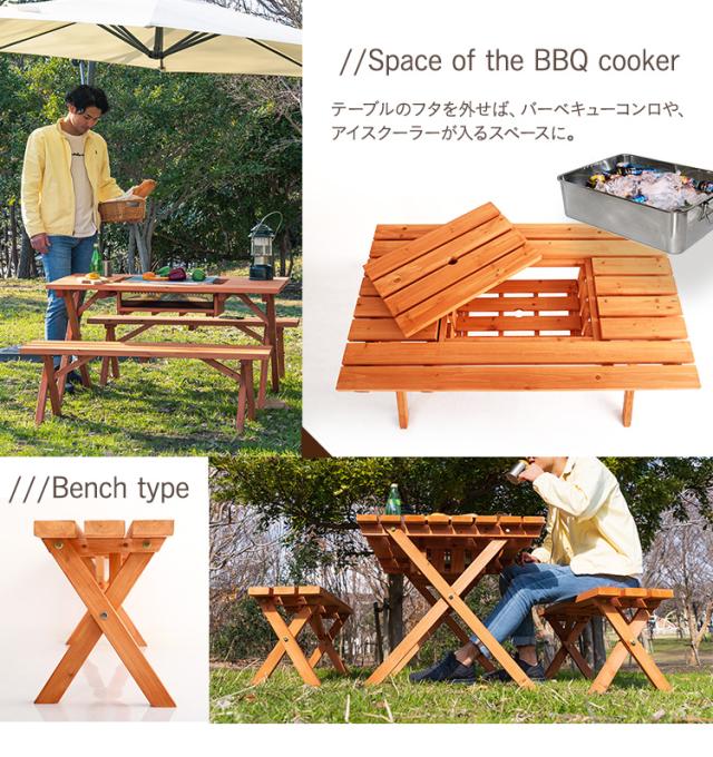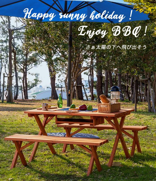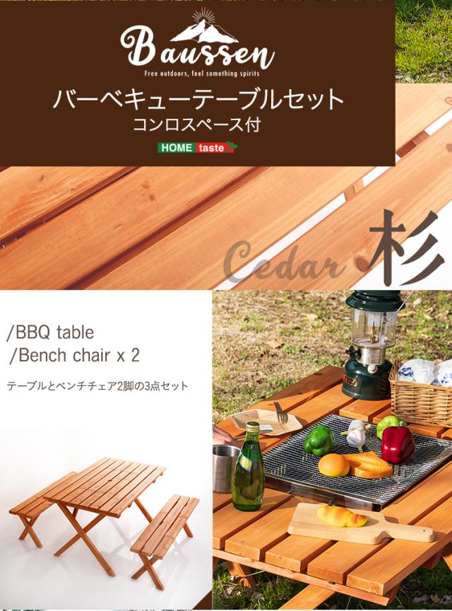 BBQテーブルセット ガーデンセット 3点 ガーデンテーブル ガーデンベンチ ガーデンチェア コンロスペース付き ガーデンチェアー アウトドアテーブル アウトドアチェア バーベキュー BBQ おしゃれ 木製 屋外 庭 コンロ Baussen(バウゼン)
