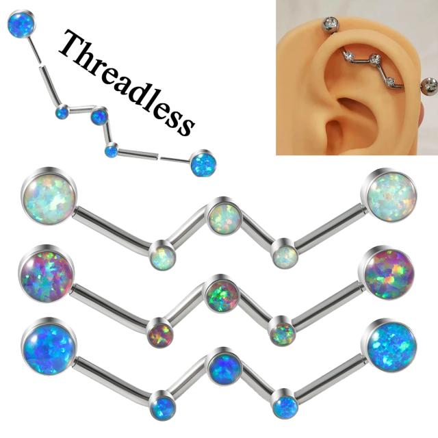 高級感のあるホワイトオパールやブルーオパールやパープルオパールのようなジュエルをセットしたインダストリアル用ボディピアス。上品に輝くオパールのようなストーンが星空のように輝く綺麗な石付きボディーピアス。キャッチがネジタイプではなく、差しこむだけでキャッチが着けれるタイプなので、不器用な人でも簡単にインダストリアルに使えるボディーピアスです。