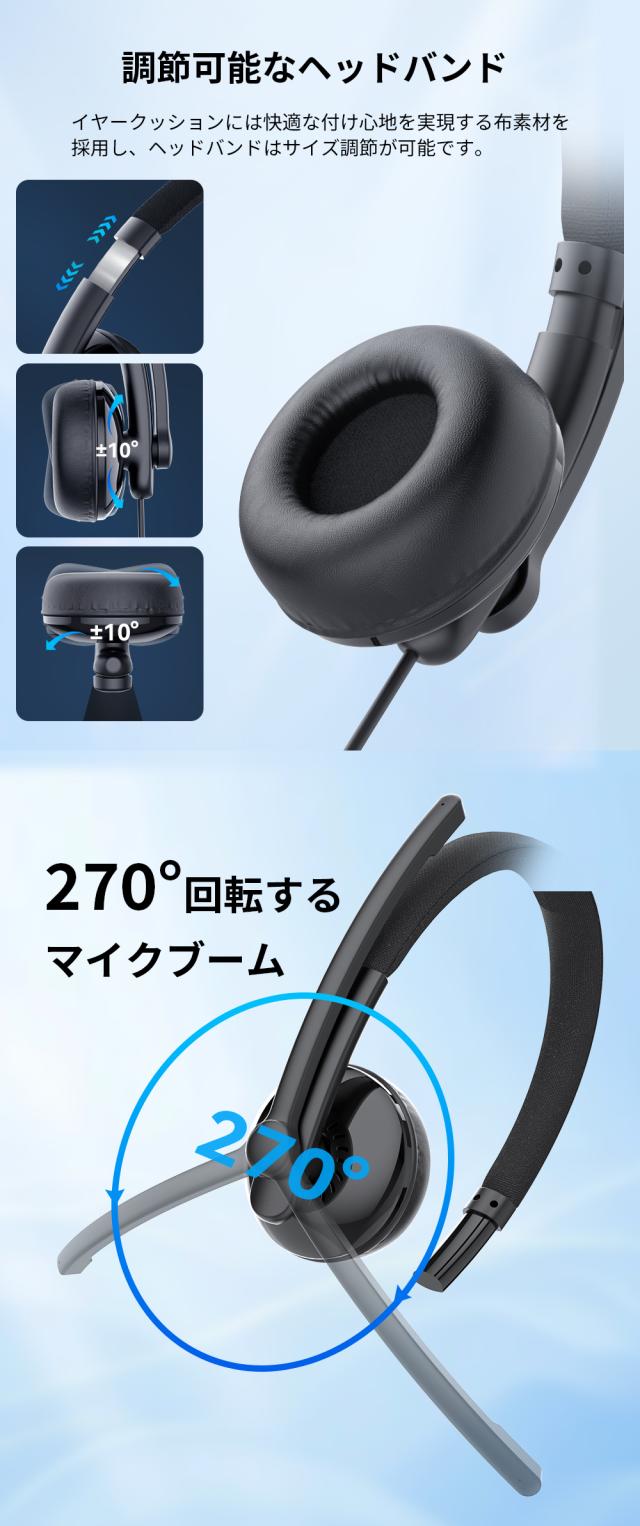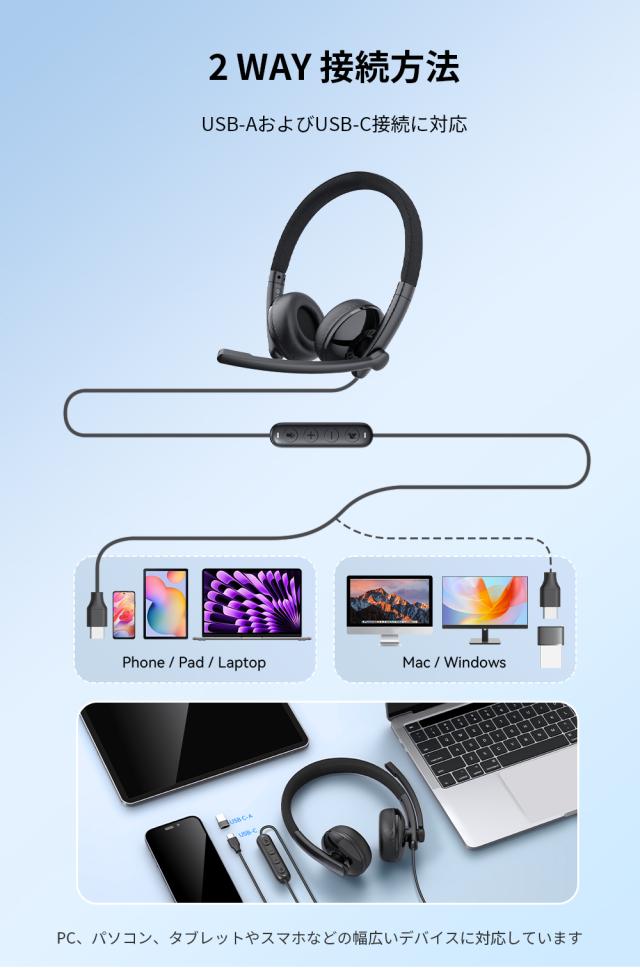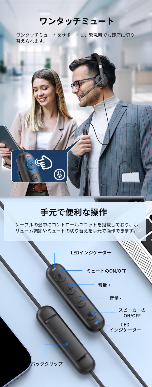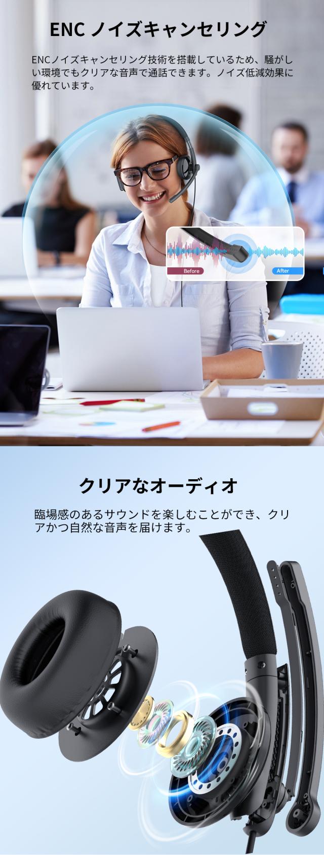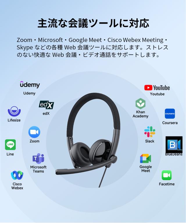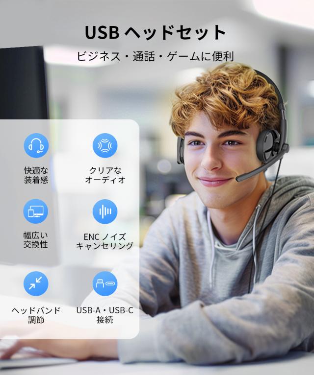 軽量で柔らかいイヤーパッドにより長時間装着でも疲れにくく、USB接続のプラグ&プレイで簡単に使用可能。ZoomやTeamsなど主要なWeb会議ツールに対応し、在宅勤務・オフィスワークを快適にサポートします。