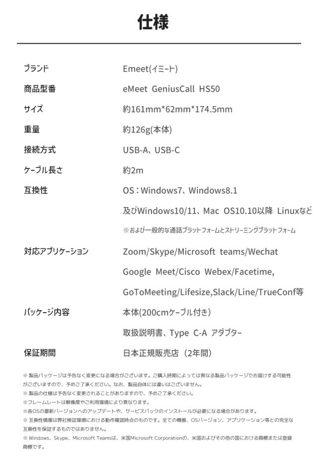 EMEET HS50は軽量設計でありながら耐久性にも優れており、日常の持ち運びや長時間作業にも適しています。USB接続のプラグ&プレイ方式で、面倒なドライバーインストールは不要。PCやノートパソコンに接続するだけですぐに使用でき、Zoom、Microsoft Teams、Google Meet、Skypeなど主要なWeb会議ツールに対応しています。