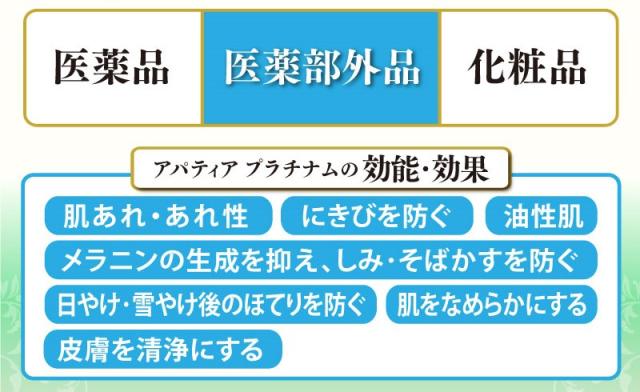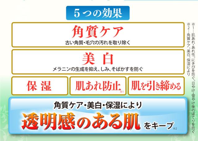 | 効果・効能 | 肌あれ・あれ性。にきびを防ぐ。油性肌。メラニンの生成を抑え、しみ、そばかすを防ぐ。日やけ・雪やけ後のほてりを防ぐ。肌をなめらかにする。皮膚を清浄にする。 |
