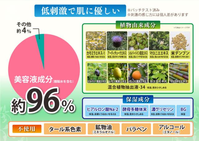 | 全成分 | 有効成分:水溶性プラセンタエキス、グリチルリチン酸2K その他の成分:アクリル酸・メタクリル酸アルキル共重合体、濃グリセリン、米デンプン、混合植物抽出液-34、シルバーバイン果実エキス、カモミラエキス-1、酵母多糖体末、アーティチョークエキス、マロニエエキス、ヒアルロン酸Na-2、塩化トリPOE(5)ステアリルアンモニウム、BG、フェノキシエタノール、香料、精製水 |