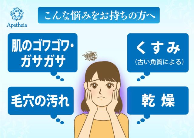 | ご使用方法 | (1)洗顔後の清潔な肌にご使用ください。水気をとり適量(2〜3プッシュ)を顔全体にのばしてください。 (2)指全体を使い、クルクルと優しくマッサージするようになじませます。 (3)ポロポロとなってきたら水またはぬるま湯で十分に洗い流してください。 (4)その後化粧水など普段のお手入れをしてください。 ◇お肌の状態に合わせて、週2〜3回のお手入れをおすすめします。 ◇お手入れの際は強くこすりすぎないようにご注意ください。 ◇ひじ、ひざ、かかと等全身の気になる部分にもお使いいただけます。 |