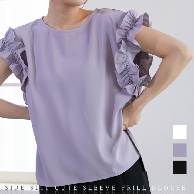 袖フリル ブラウス オーバーシルエット ゆったり トップス Tシャツ ティアード シャツ 立体感が目立つフリル 夏 夏服 おしゃれ 大人可愛い スリット きれいめ 上品 華やか 高見え エレガント 麻風の表梨地ポンチ素材