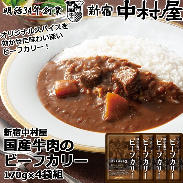 170gx4食 レトルトカレー(新宿中村屋 国産牛肉のビーフカリー 170gx4袋組)老舗 伝統 インドカリー 湯せん 簡単調理 ランチ 夕食 夜食お中元