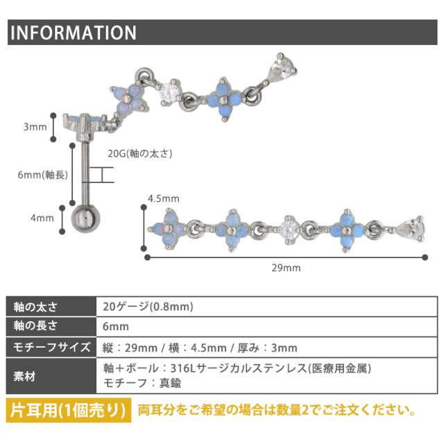 プチサイズのお花とジュエルが連なったかわいいストレートバーベル。 動くたびにゆらゆら揺れて注目を集めます。 太さはどなたでも使いやすい極細サイズの20G。 軸とボール部分はサージカルステンレス製ですが、モチーフは真鍮製ですので、アレルギーの強い方はお控えください。
