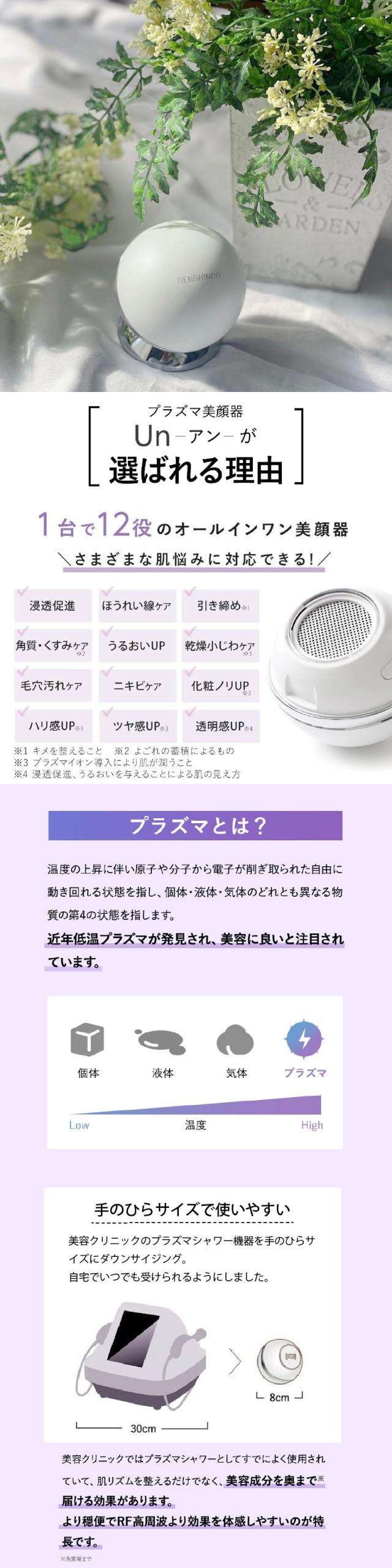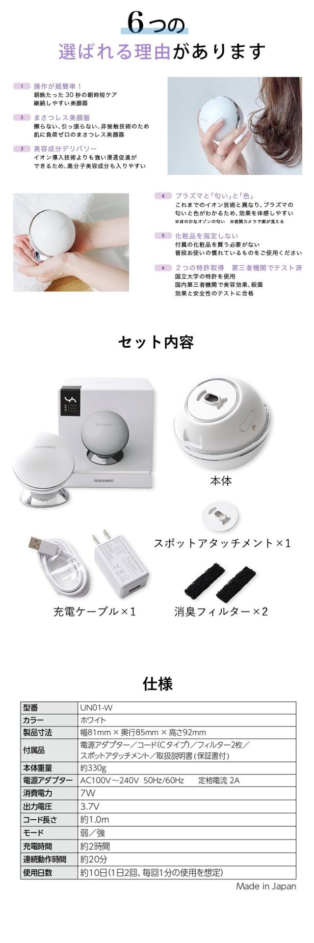 プラズマシャワー美顔器 un UN01-W DENSHINDO 傳心堂 美顔器 小型 顔 首 目元ケア 高周波 小顔 リフトケア フェイスケア 口元 ハリ肌 導入 ほうれい線 家庭用プラズマ美顔器 セルフケア プラズマシャワー エステ サロン 美容 日本製