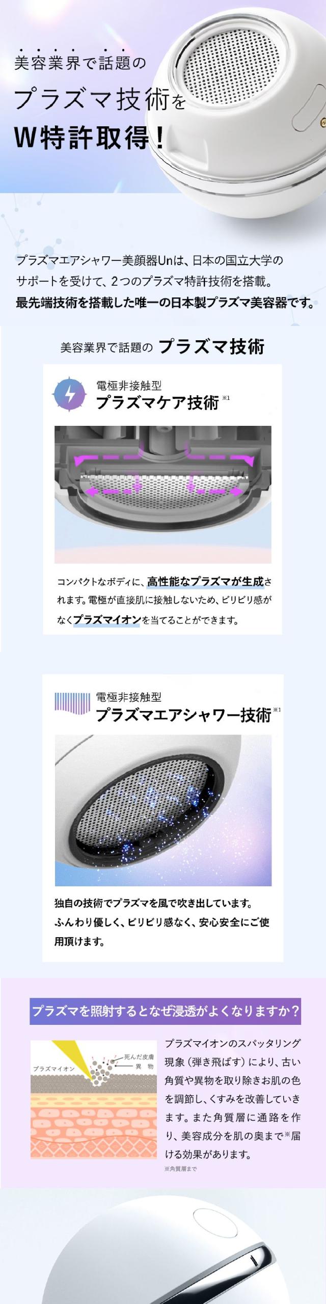プラズマエアシャワー美顔器Unは、日本の国立大学のサポート受けて、2つのプラズマ特許技術を搭載。