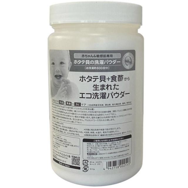 シェルミラックシリーズの中でも特に人気の高いエコ洗濯パウダーの超お得サイズ!洗浄成分ホタテカルシウムのアルカリパワーで洗浄から除菌、抗菌、消臭。界面活性剤無添加、柔軟剤不要、各繊維の持つ自然な風合いに洗い上がります。残留洗剤など肌を刺激するアレルギー反応物質が残らないので、赤ちゃんや敏感肌の方の洗濯におすすめです。生乾きや部屋干しで発生する嫌な臭いを防ぎ、洗濯槽の裏に付着するカビ、黒カビ、を抑制、除去します。配水管、排水溝のヌメリ、悪臭の除去、洗剤入すすぎも一度でOK経済的です。【内容量】600g(約600回分・1回1g)1g軽量スプーン付き。【成分】ホタテ貝殻焼成粉末、食酢【使用期限】未開封無期限、開封後は3年以内にご使用ください (開封後の湿気、水の混入厳禁)【生産国】日本【販売元】ベビーマークアソシエイツ