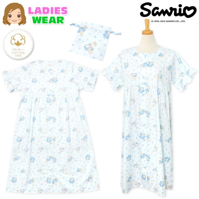 【送料無料】婦人 レディース 綿100% 半袖 ワンピース パジャマ Sanrio サンリオ マロンクリーム 前開き ブロード生地 ミニ巾着付き ポケット付き M-L yg-2354b-sx【メール便対応】