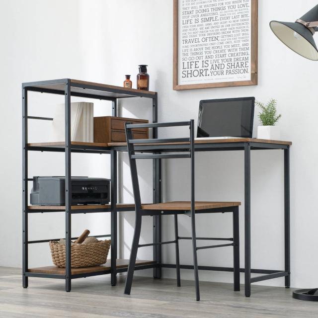 インテリアに馴染むシンプルなデスク、チェア、4段ラックのセットです。それぞれが完全に独立しているので、お部屋や生活スタイルに合わせて自由にレイアウトしていただけます。