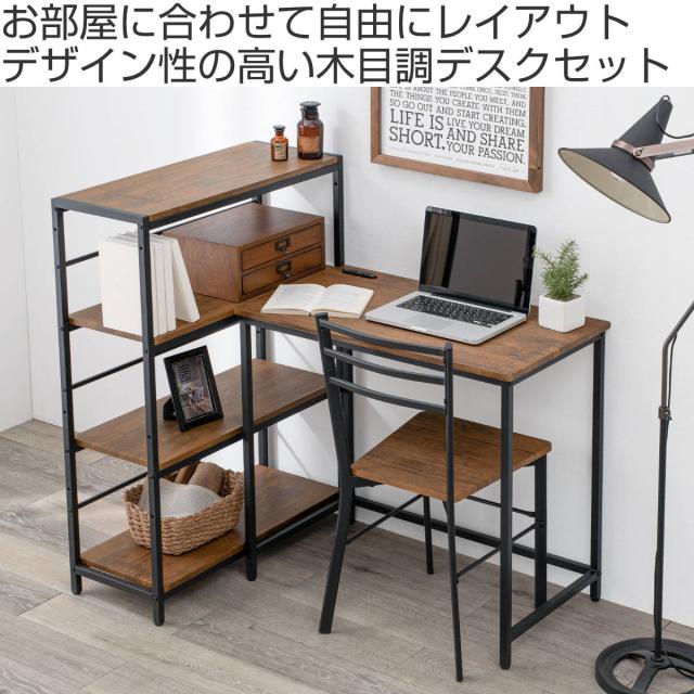 デスク チェア 3点セット デスク×1 4段ラック×1 チェア×1 ( L字 机 セット コンセント付き 組合せ レイアウト 自由 ラック 棚 収納 スチール 木目調 白 黒 ブラウン ナチュラル 北欧 カントリー調 )