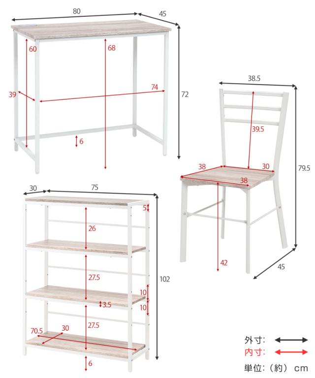 | サイズ | デスク:約 幅80×奥行45×高さ72(cm) チェア:約 幅38.5×奥行45×高さ79.5(cm)、座面高 約42(cm) 4段ラック:約 幅75×奥行30×高さ102(cm) |