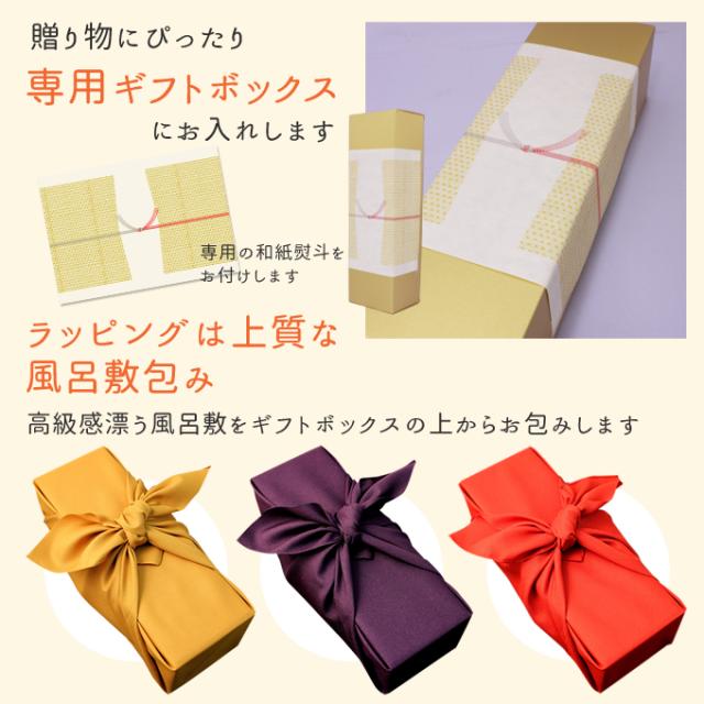 新潟産の純米大吟醸に金箔を入れた豪華なお祝い酒。瓶と同色の高級風呂敷に包んでお届けします。