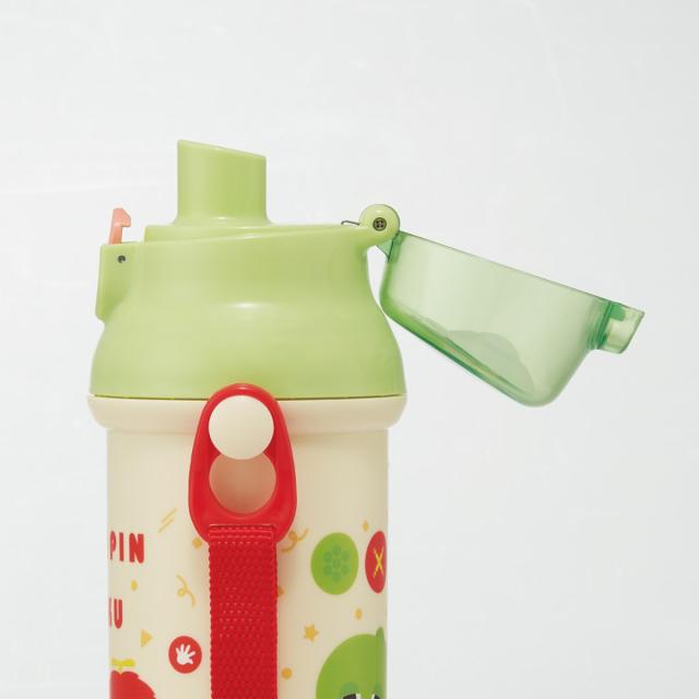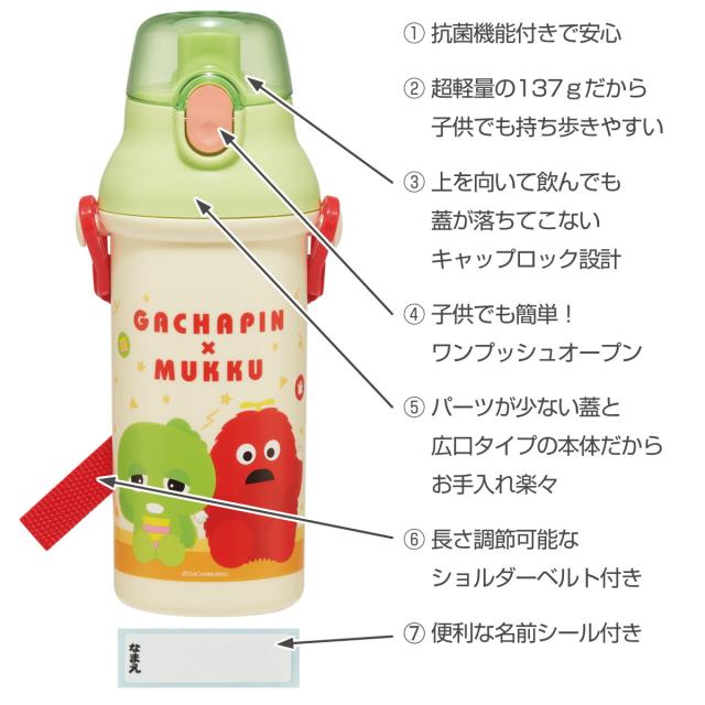 水筒 480ml 抗菌直飲プラボトル ガチャピンムック ( 子供用 抗菌 プラスチック製 ダイレクトボトル 直飲み ワンタッチ 日本製 抗菌加工 AG 銀 ショルダーベルト付き 広口 軽量 ボトル ワンプッシュ )