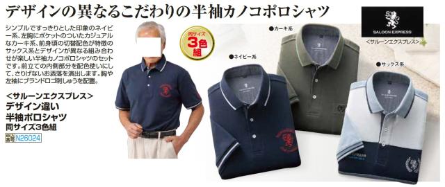 シンプルですっきりとした印象のネイビー系、左胸にポケットのついたカジュアルなカーキ系、前身頃の切替配色が特徴のサックス系とデザインが異なる組み合わせが楽しい半袖カノコポロシャツのセットです。