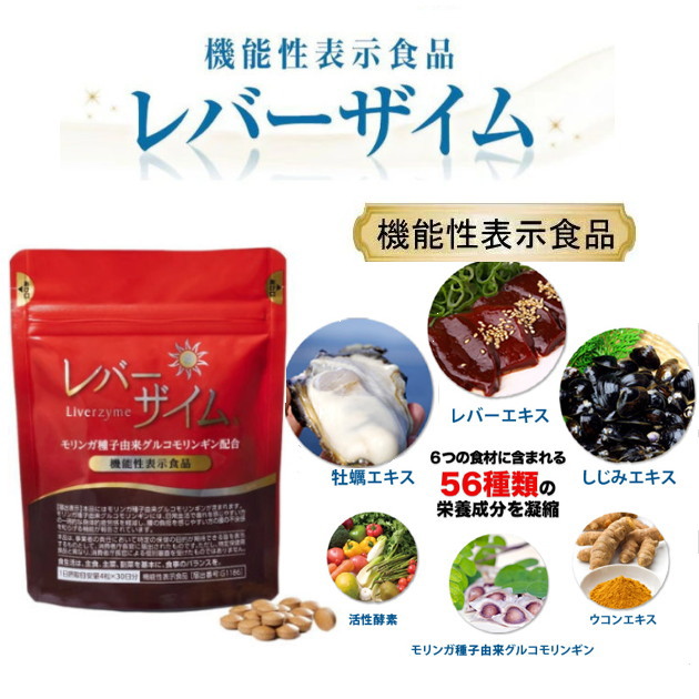 レバーザイムは、「レバーエキス」「牡蠣エキス」「活性酵素」「ウコンエキス」「しじみエキス」に加え、機能性関与成分「モリンガ種子由来グルコモリンギン」を主成分としています。