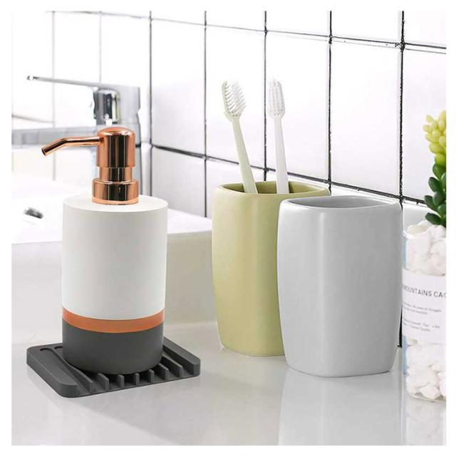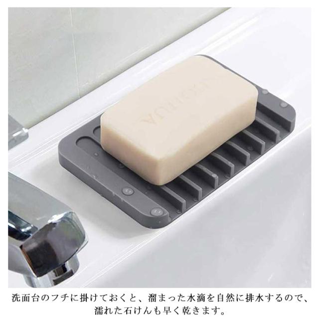 | 石けんの水気をしっかり切ってくれる水が溜まらない石けん置き。 石けんがしめりにくいので、溶けにくく、長持ちしてとっても経済的です。 板状の形に凸凹の溝を作ることで、石鹸へ触れる部分を極力少なく。凹部分は斜めになっているので水を即座に流し、水捨ての手間もいりません。 洗面台のフチに掛けておくと、溜まった水滴を自然に排水するので、濡れた石けんも早く乾きます。 撥水性が高く柔軟性もあるシリコン製、錆や破損などを気にせずまるっと洗えてお手入れも簡単なんです。 モノトーンなカラーリングとシンプルなデザインは、洗面所やキッチンなど置く場所を選ばず自然と空間に馴染んでくれるので、 どんなお住まいの方でも取り入れやすいアイテムです。 | |