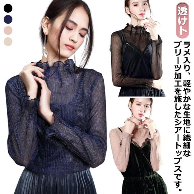 ラメ入り プリーツtシャツ シアー トップス インナー シアートップス 透けトップス レディース ハイネック 長袖 肌着 下着 重ね着 メロウフリル きれいめ レイヤードトップス 春 夏 S M L XL 2XL