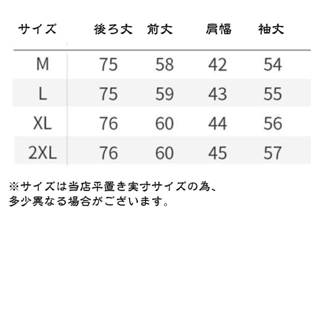 | サイズについての説明 | サイズ 後ろ丈 前丈 肩幅 袖丈 ※サイズは当店平置き実寸サイズの為、多少異なる場合がございます。 |