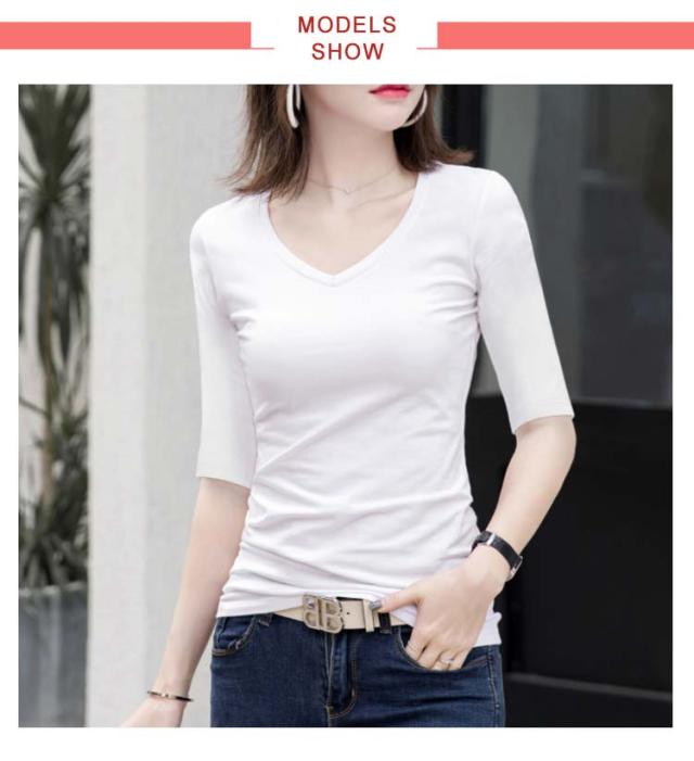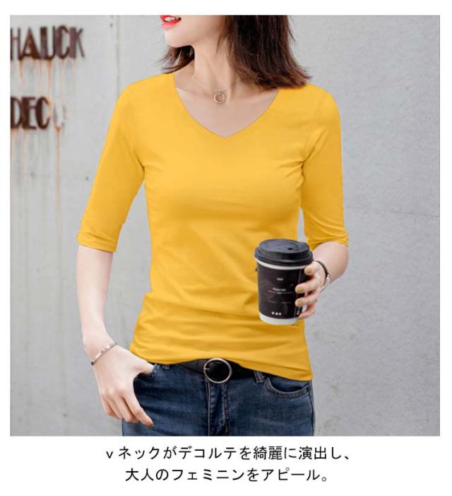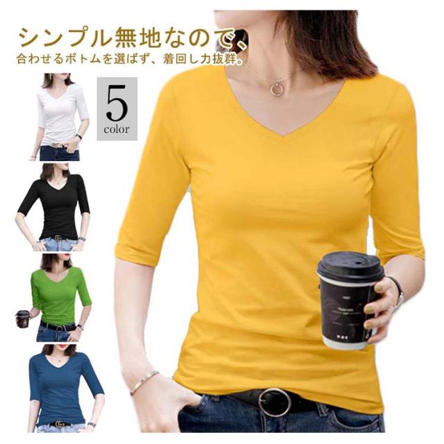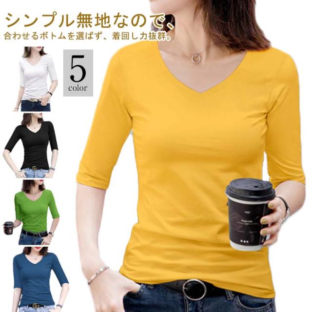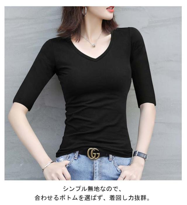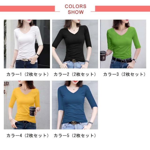 2枚セット!Vネック レディース 夏 ストレッチ 五分袖tシャツ tシャツ 無地tシャツ カットソー 半袖 キレイめ トップス タイト コンパクト 細身 インナー 五分袖tシャツ 5分袖 送料無料