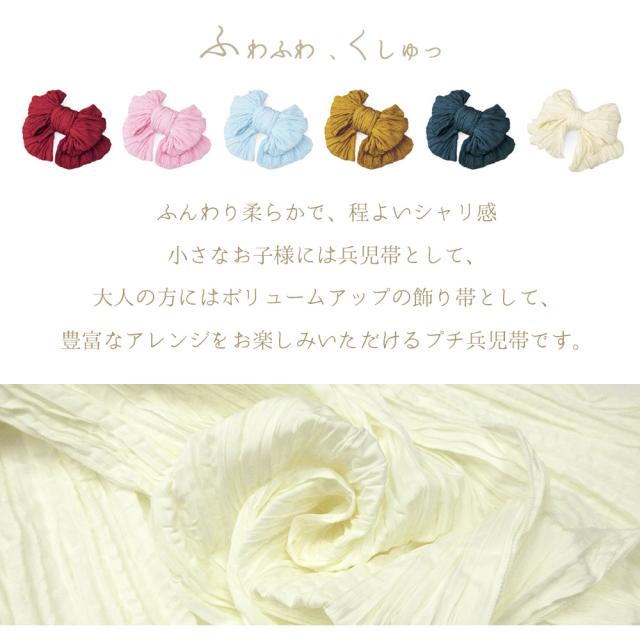 【1枚までメール便送料無料】プチ 兵児帯 子供用 ぷち へこ帯 飾り帯 浴衣 シワ 帯 ふわ くしゅ 全6色 日本製 ゆかた帯 浴衣帯 無地 レディース ジュニア 赤 黄色 水色 ピンク ターコイズ アイボリー 白 和装 洒落 ゆかた 夏着物 花火大会 縁日 夏祭り