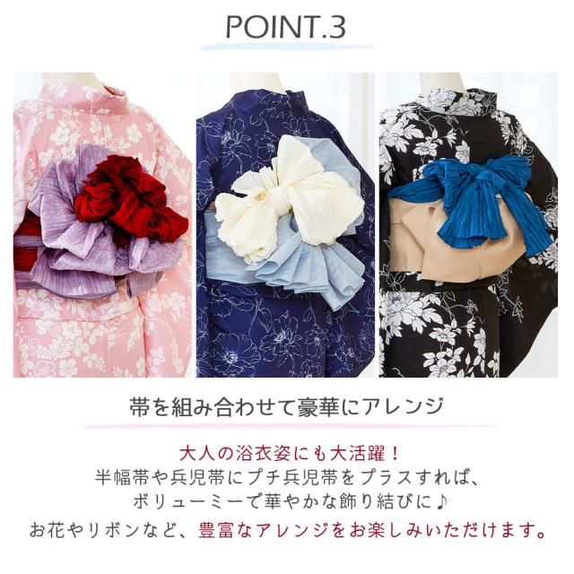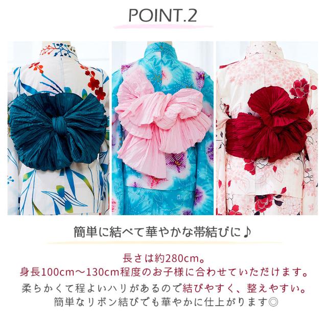 小さなお子様には兵児帯として、大人の方にはボリュームアップの飾り帯として幅広くお使いいただけます。