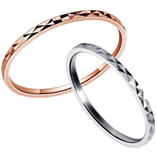 輝く多面切割デザイン:083BASEのリングは、多面切割による独特の輝きが特徴です。指に馴染む1mm幅で、シルバーカラーとローズゴールドカラーがあります。