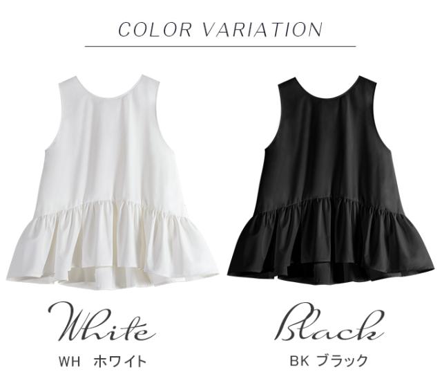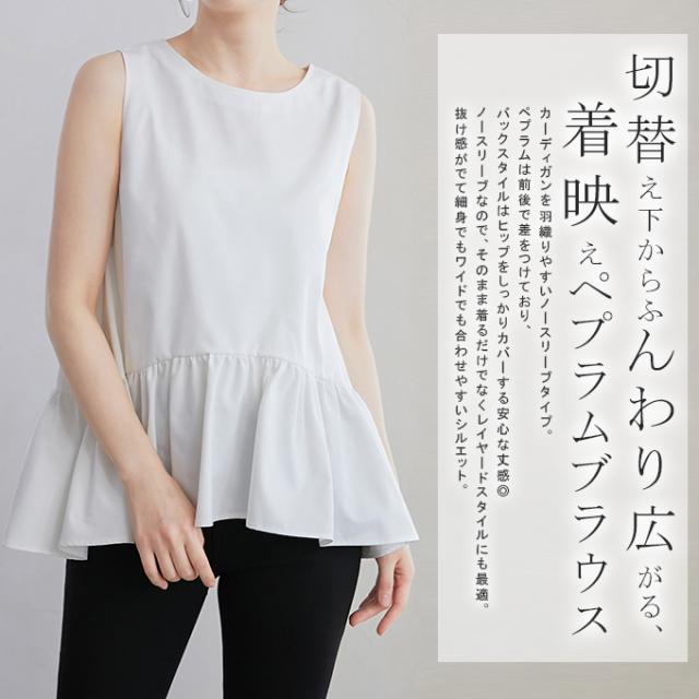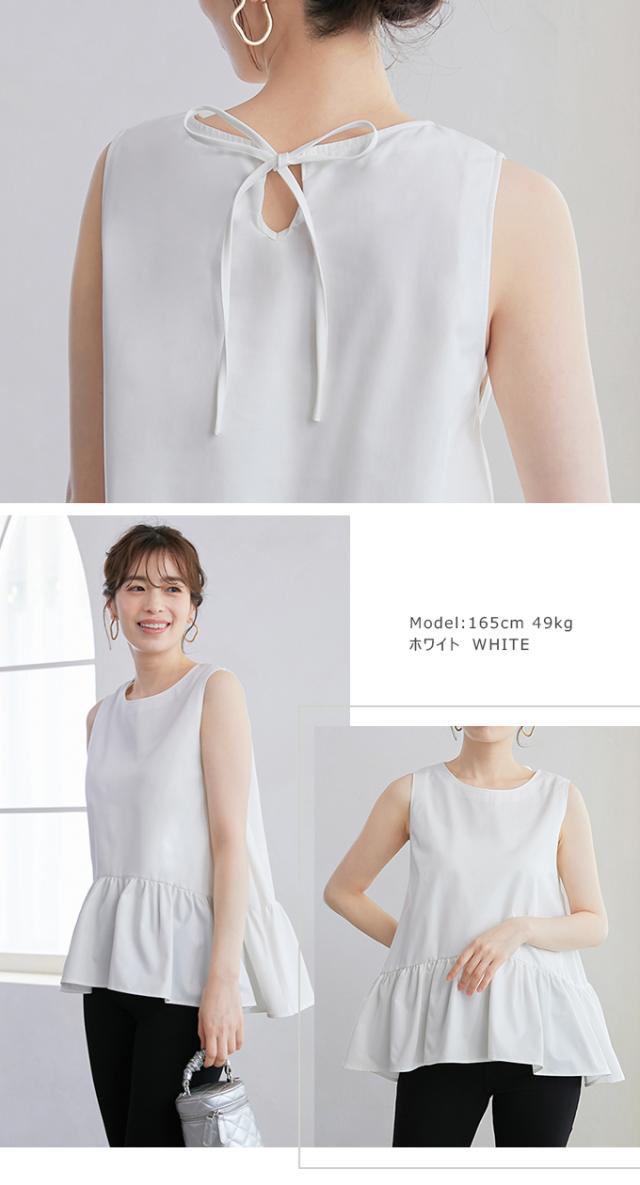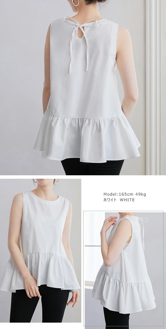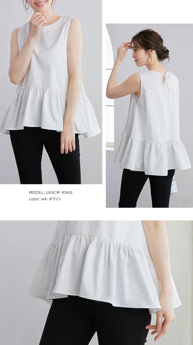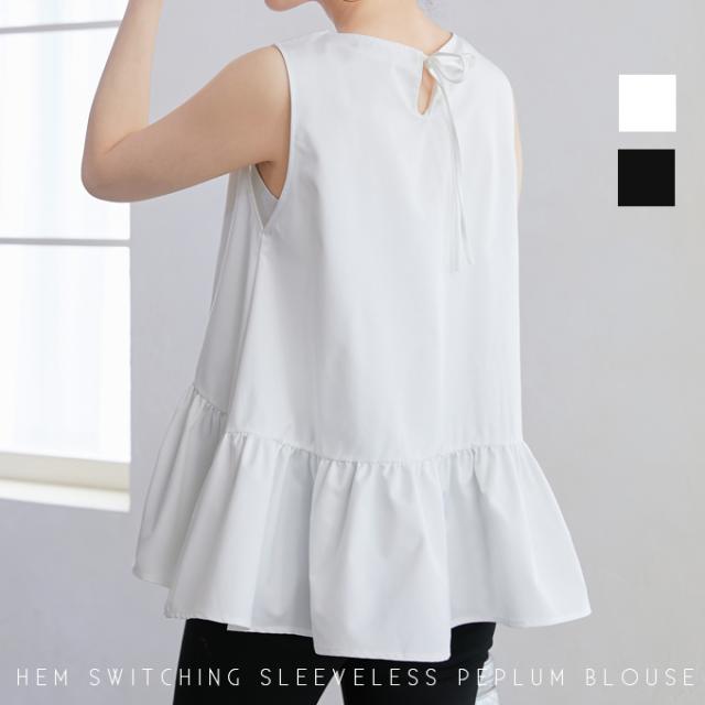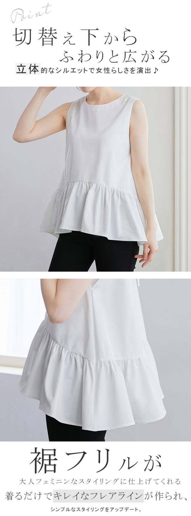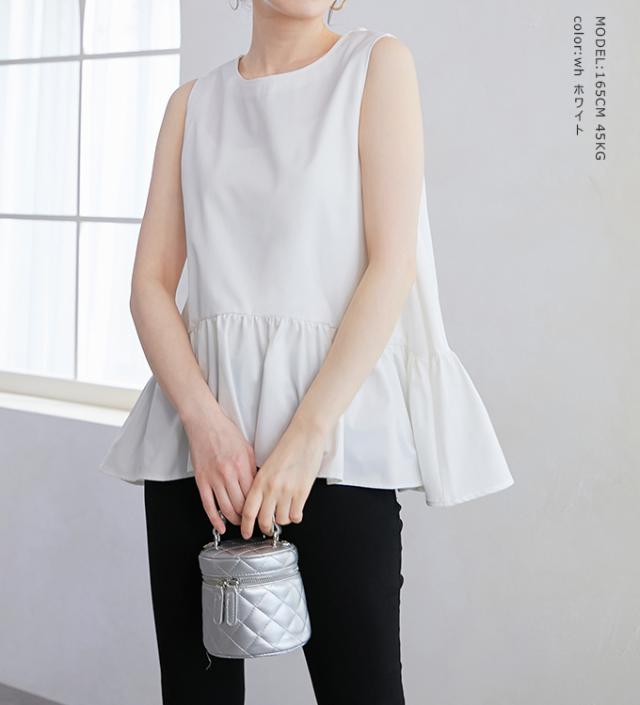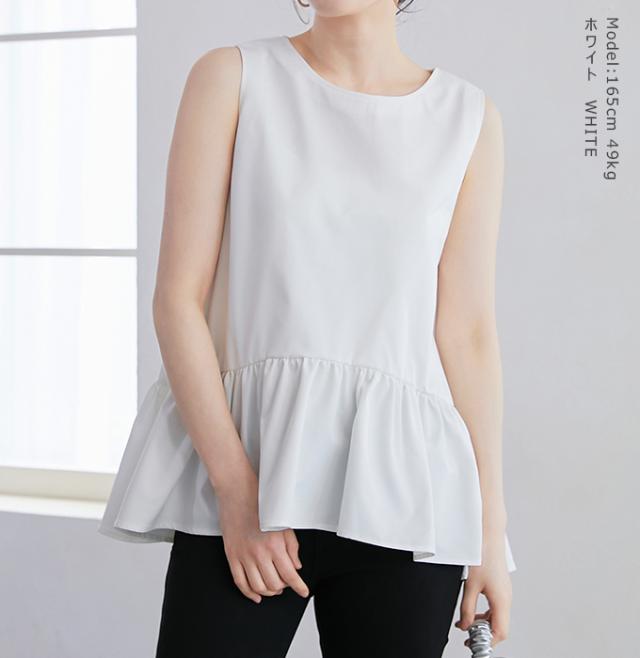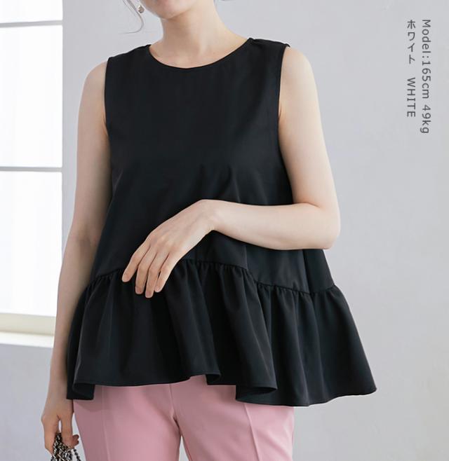 ノースリーブ ペプラムブラウス 裾フリル ノースリ トップス 春 夏 レイヤード 無地 重ね着 チュニック お尻 お腹 体型カバー フレア ボリューム ティアード 裾切替え クールネック ホワイト ブラック