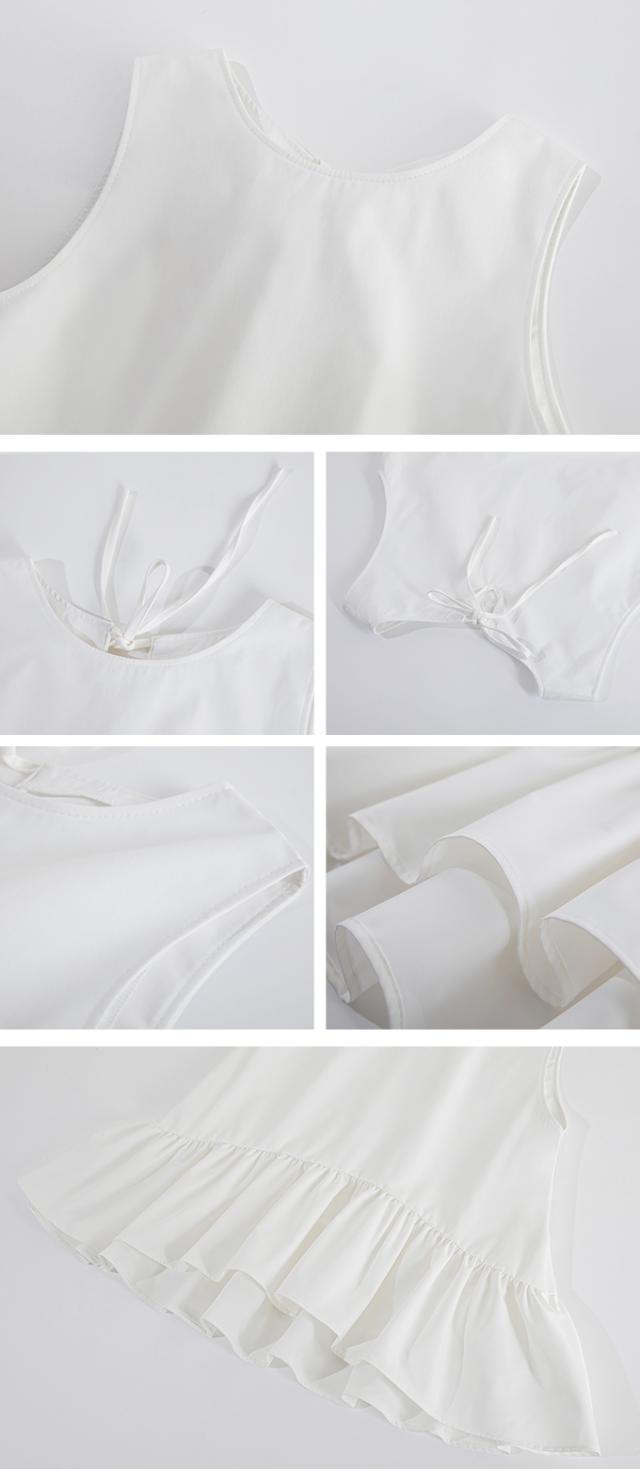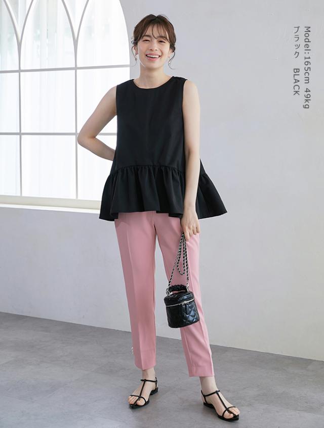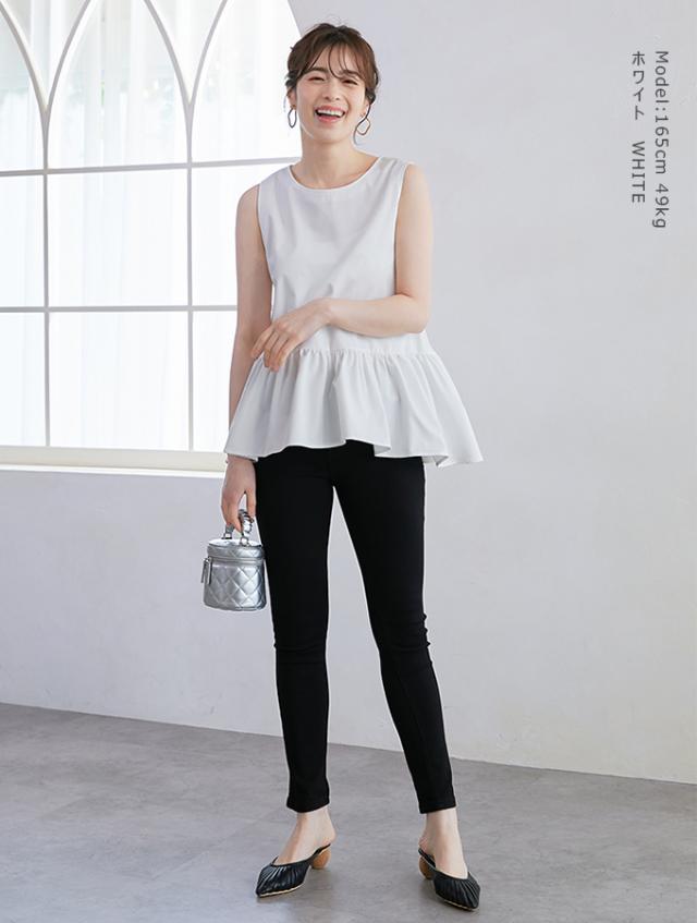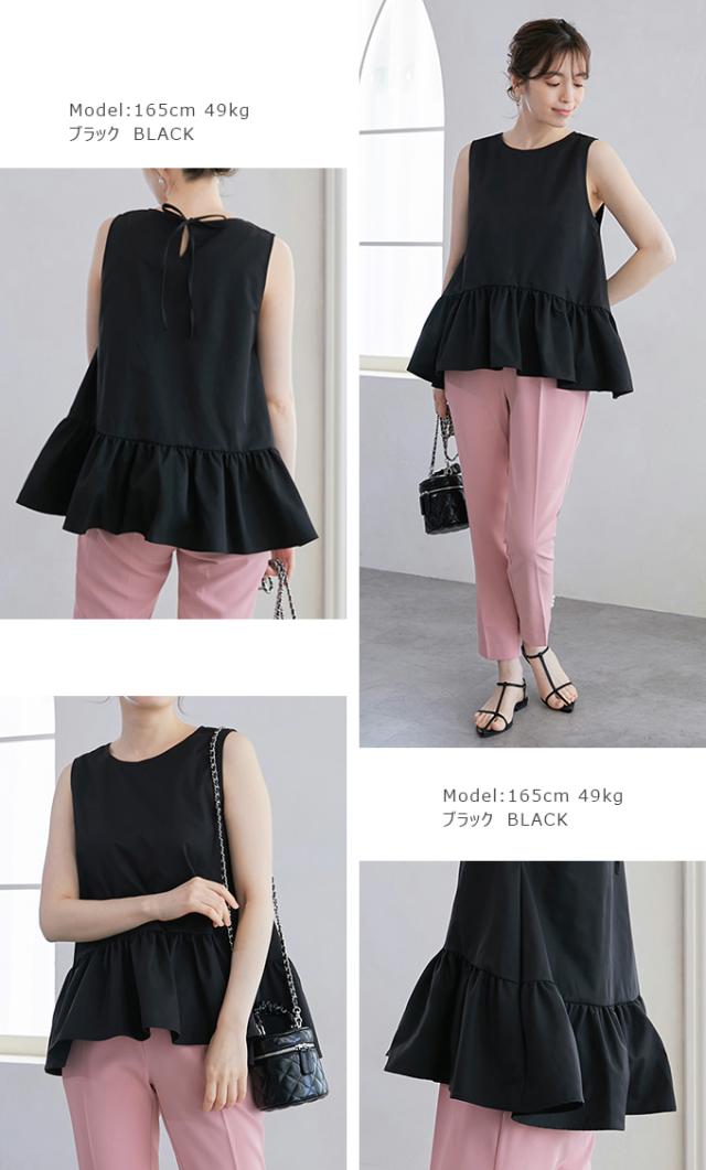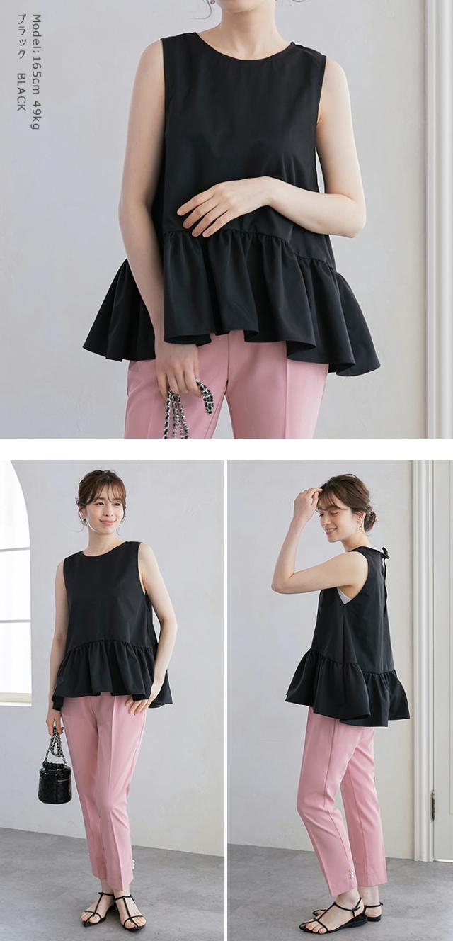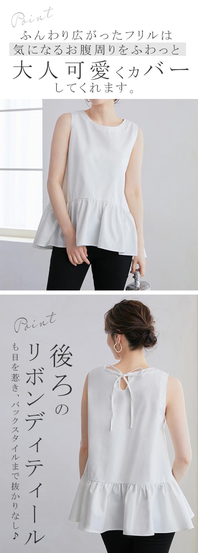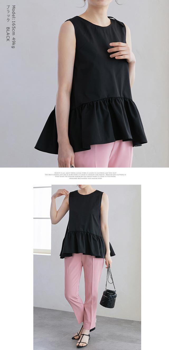 ノースリーブ ペプラムブラウス 裾フリル ノースリ トップス 春 夏 レイヤード 無地 重ね着 チュニック お尻 お腹 体型カバー フレア ボリューム ティアード 裾切替え クールネック ホワイト ブラック