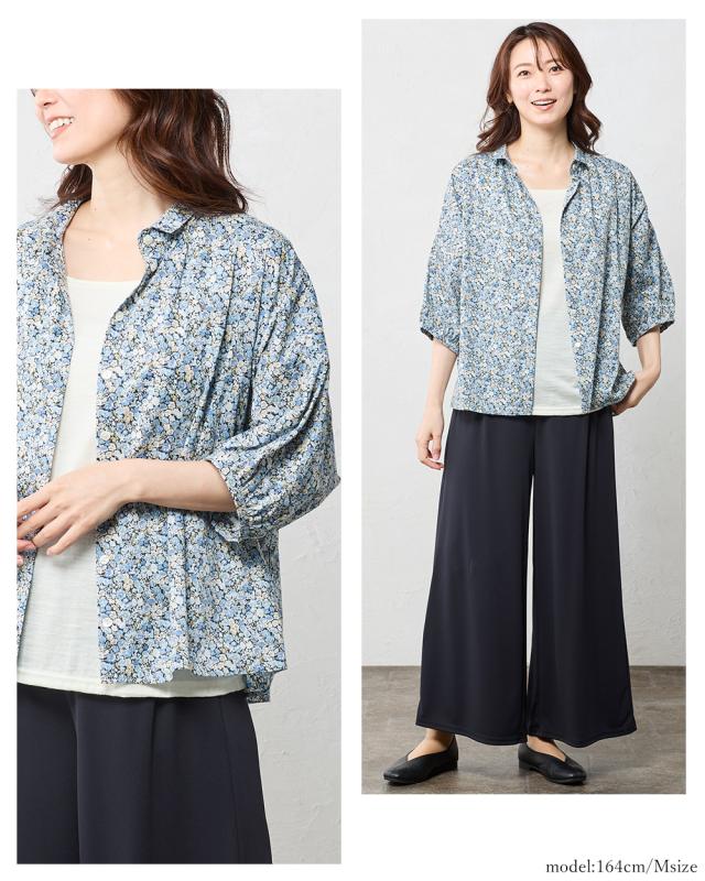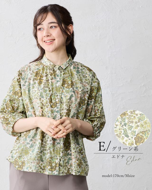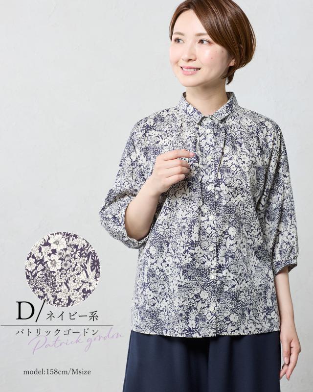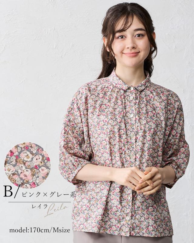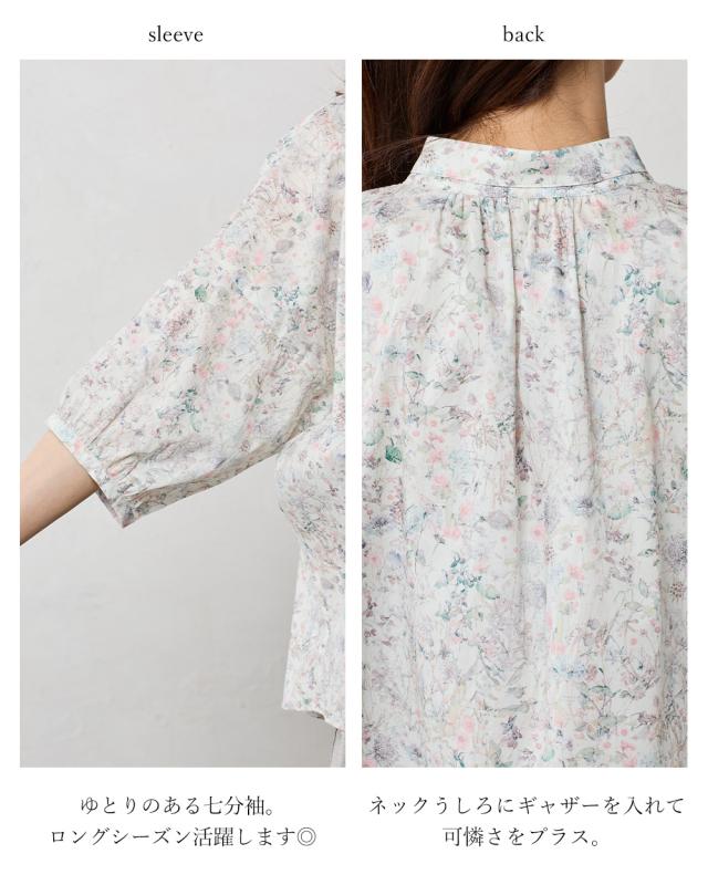 リバティ LIBERTY 7分袖 シャツ シャツカラー 日本製 花柄 フラワー 衿ギャザー 綿100% コットン 綿 ブラウス ドルマン 羽織 重ね着 レイヤード ファッション レディース 女性 春 夏 襟付き 40代 50代 60代 大人可愛い トップス カジュアル タナローン