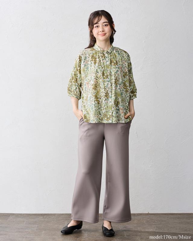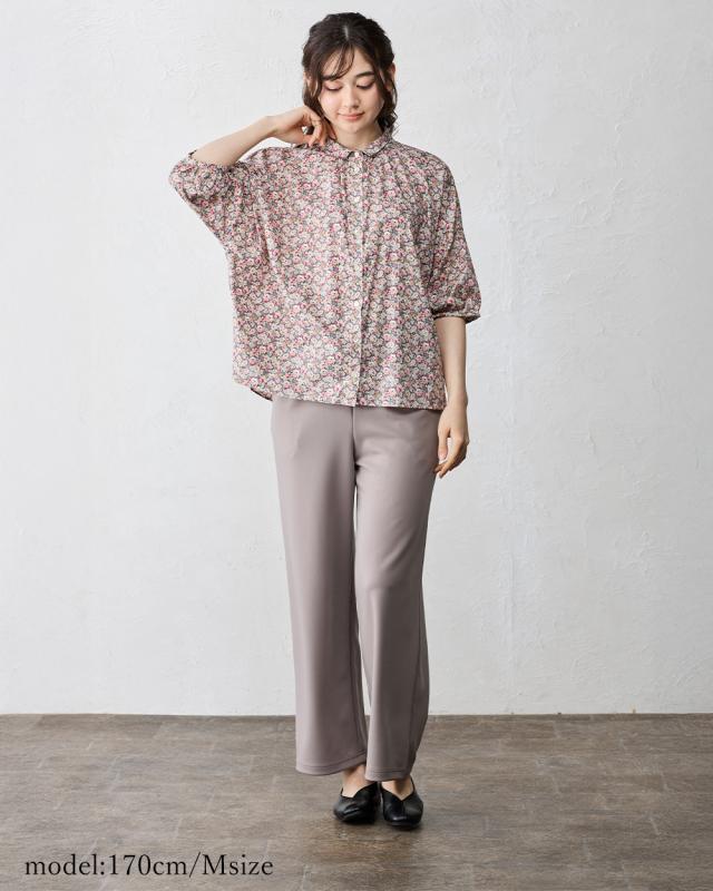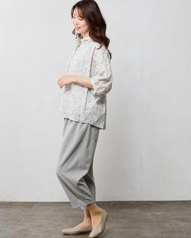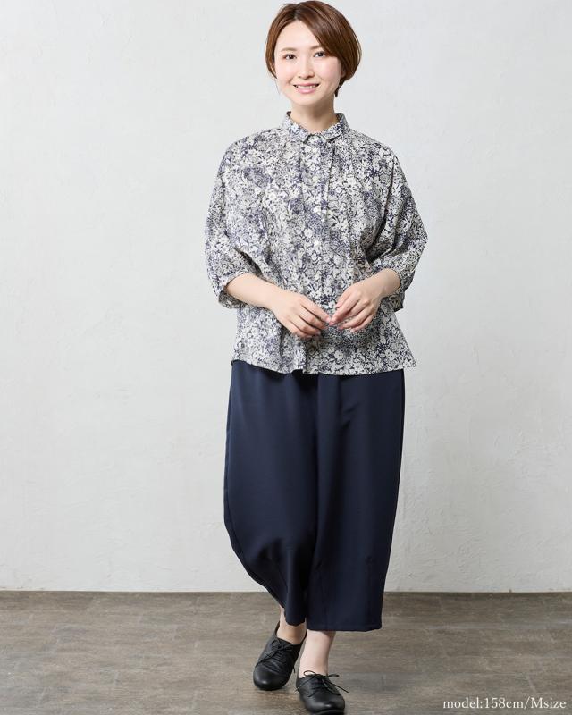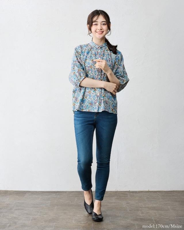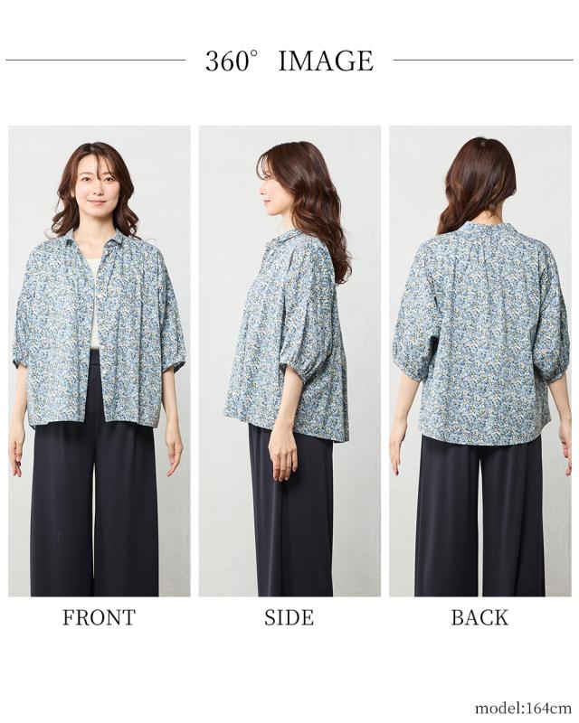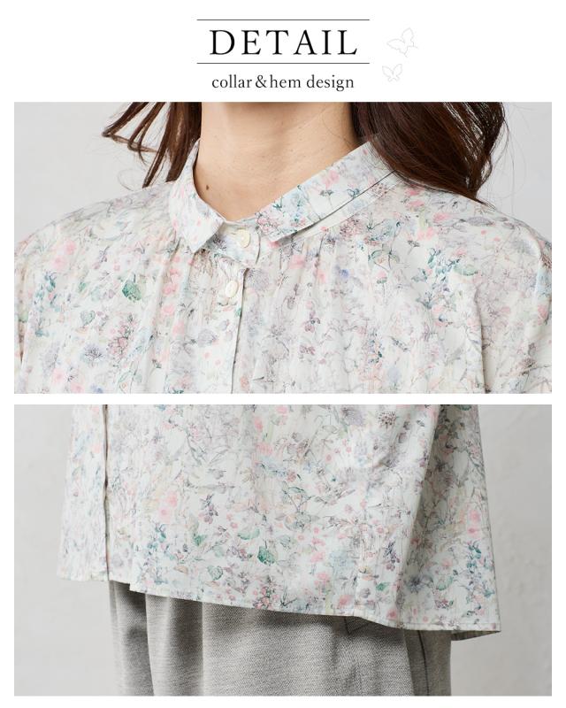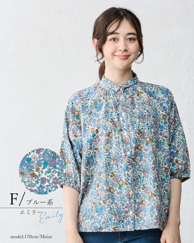 | 商品詳細/その他 | リバティプリント生地を使用した、衿にギャザーを寄せた着まわしやすい7分袖ベーシックシャツ。 |
