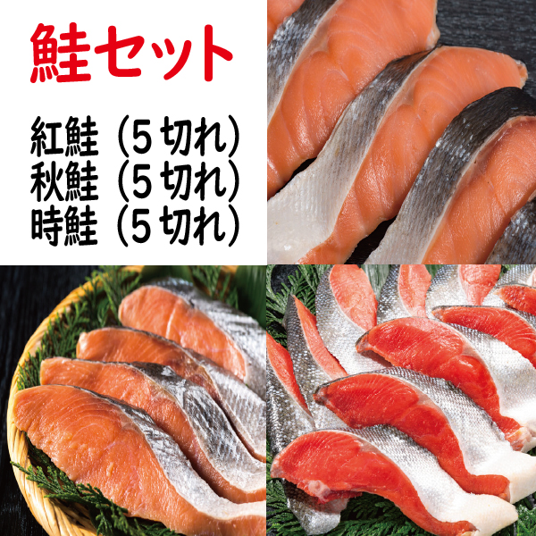 鮭セット 紅鮭(5切れ)、時鮭(5切れ)、秋鮭(5切れ)