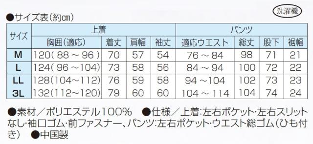 ●仕様/上着:左右ポケット・左右スリットなし・袖口ゴム・前ファスナー、パンツ:左右ポケット・ウエスト総ゴム(ひも付き)