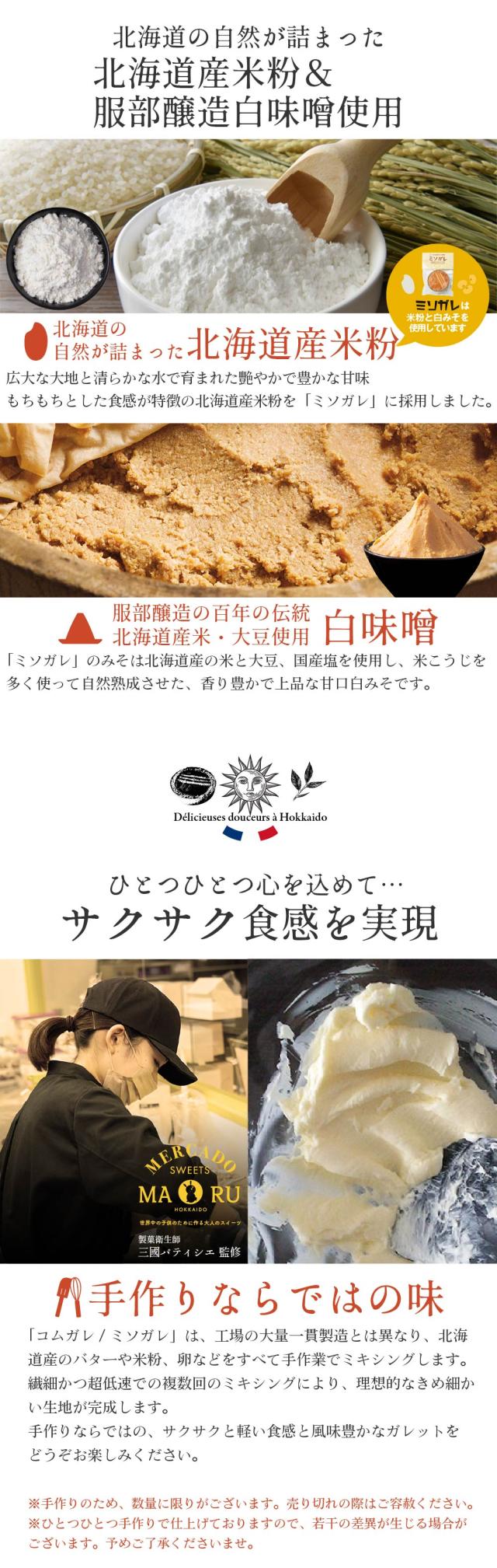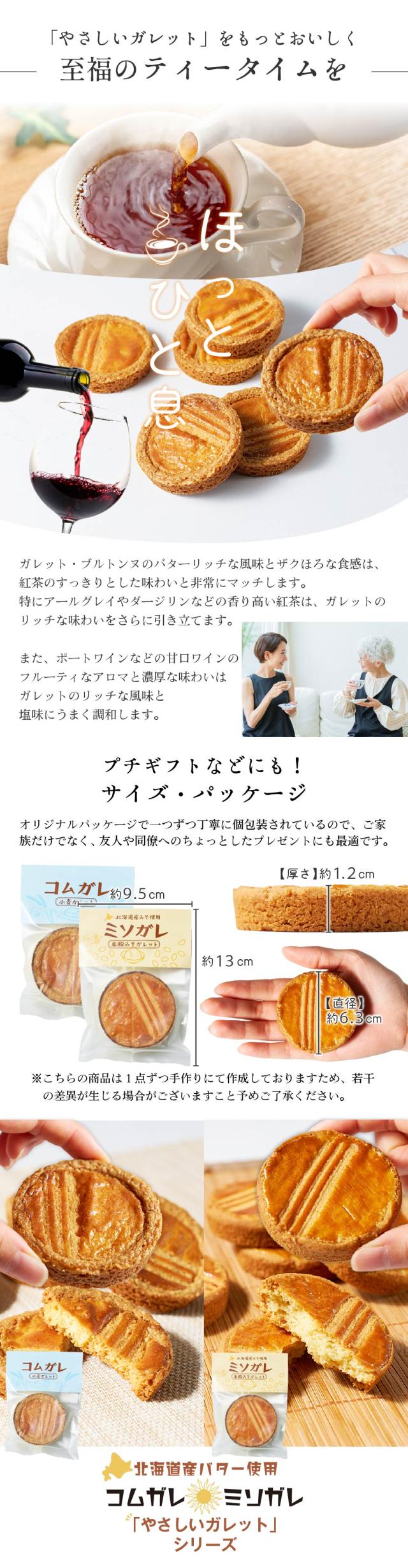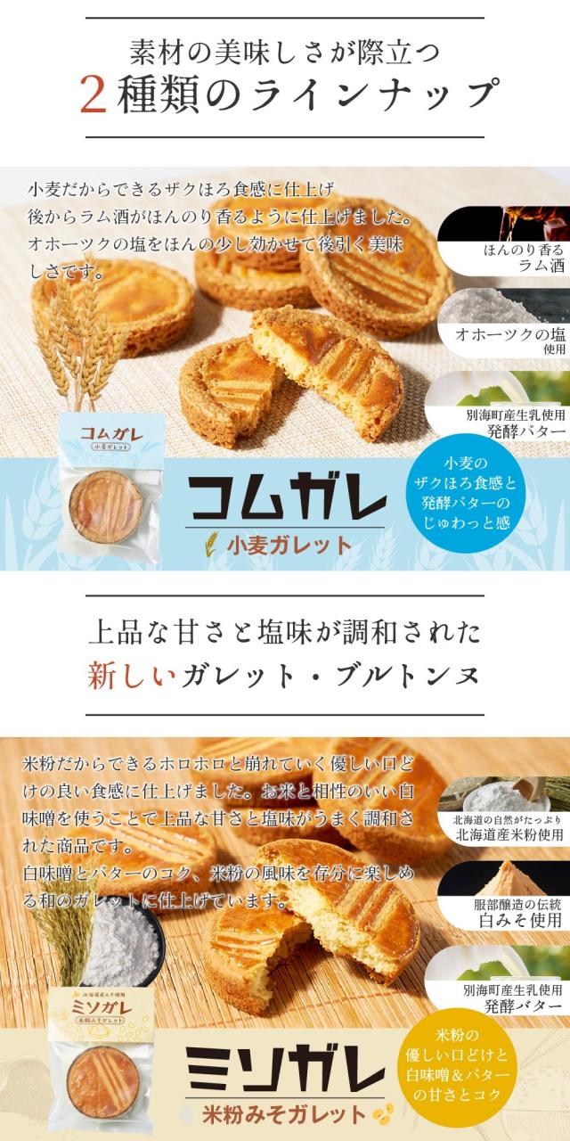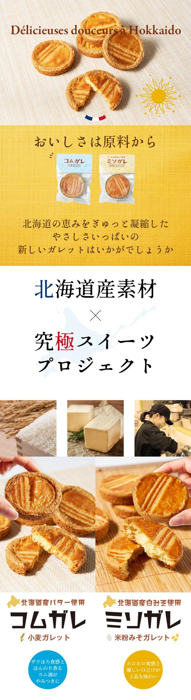 | 商品説明 | 札幌中央卸売市場の場外市場にあるスイーツ店「メルカードスイーツまる」発のガレット「コムガレ」「ミソガレ」が新登場!! ■「コムガレ」(小麦ガレット) 小麦だからできるザクホロ食感に仕上げ、後からラム酒がほんのり香るように仕上げました。 オホーツクの塩をほんの少し効かせて、あと引く美味しさです。 別海町産の生乳を使用した発酵バターをたっぷり使用し、バターのじゅわっと感を楽しめる贅沢なガレットに仕上げています。 是非とも、北海道の恵みをぎゅっと凝縮した、やさしさいっぱいの新しいガレットをお楽しみください! |