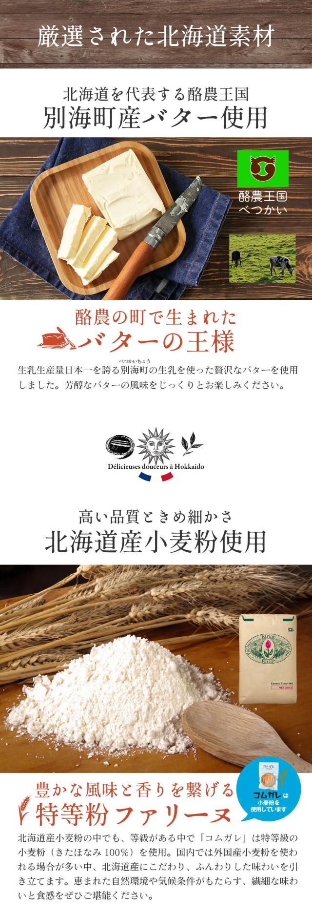 | 原材料名 | バター(北海道産)、小麦粉、砂糖、卵黄、アーモンド、ラム酒、塩(一部に乳成分・小麦・卵・アーモンドを含む) |