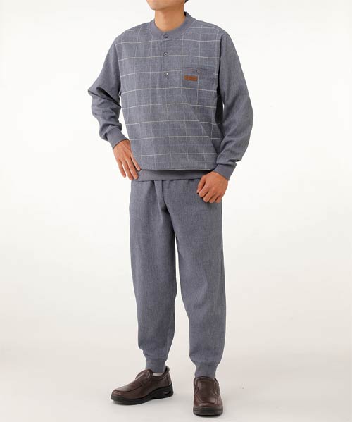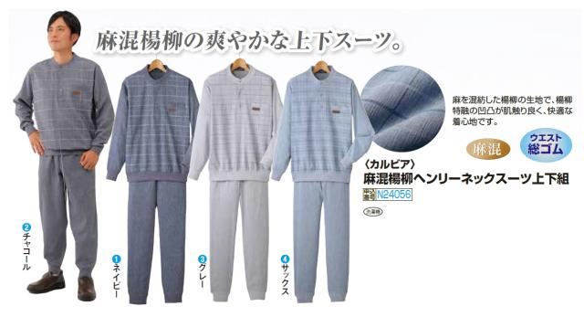 カルビア 麻混楊柳ヘンリーネックスーツ上下組 全4色 上下セット ホームスーツ ホームウェア 長袖 チェック メンズ 紳士服 シニア 男性 ルームウェア スウェットスーツ セットアップ 部屋着 グレー ネイビー ブルー シニアファッション 40代 50代 60代 70代 80代 90代 父の日 お父さん おじいちゃん 春物 夏物 春夏