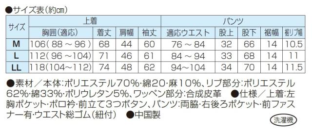 ●仕様/上着:左胸ポケット・ポロ衿・前立て3つボタン、パンツ:両脇・右後ろポケット・前ファスナー有・ウエスト総ゴム(紐付)