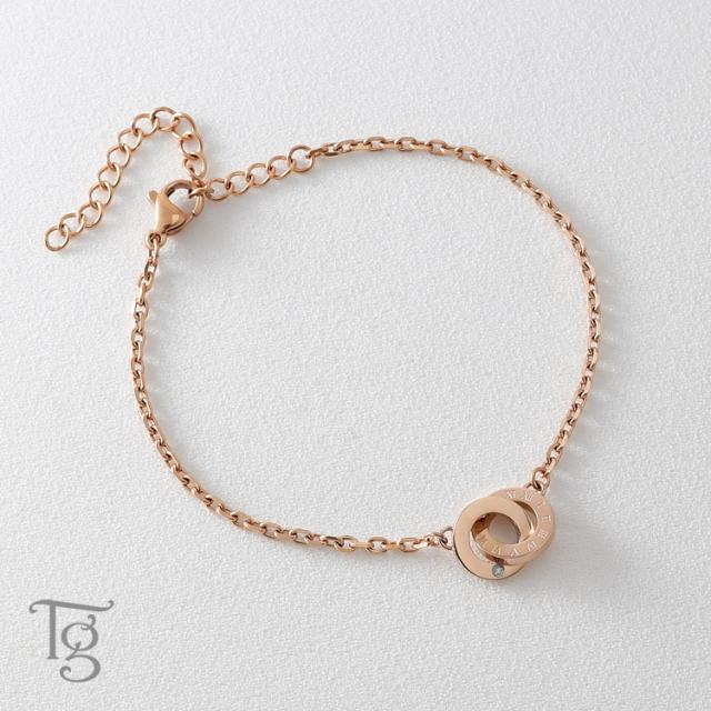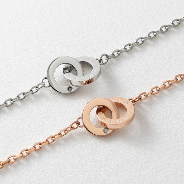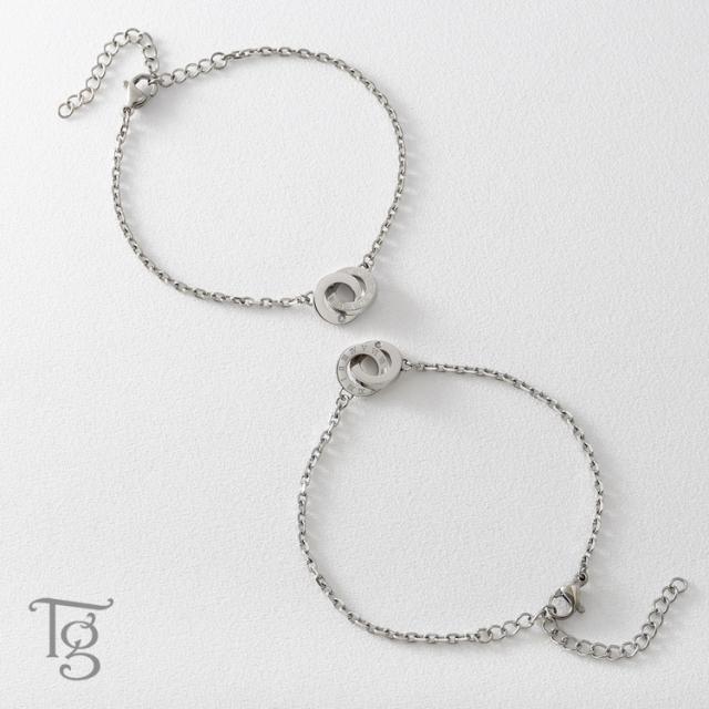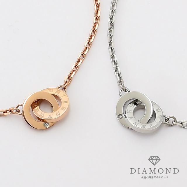 ローマ数字が刻まれたリングとダイヤモンドをあしらったリングが繋がる、インターロッキングデザインのペアブレスレット。 裏面には名入れ刻印が可能です。スティールシルバーカラー&ローズゴールドカラーのペアになります。