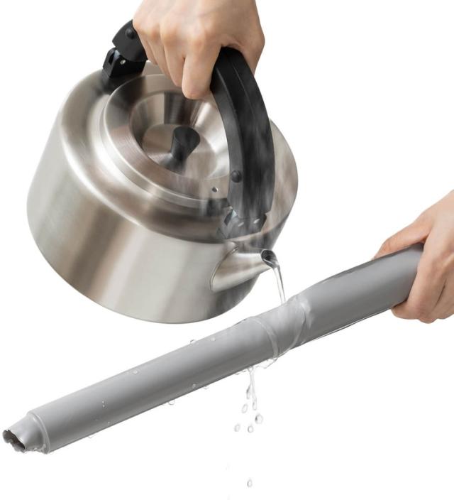 アイデア次第で色々使える、物干し用の補修用カバー。物干し竿にかぶせ、お湯をかけるとぴったりカバーでき、劣化を防ぐ。お湯をかけるかドライヤーの熱風をあてるだけで熱収縮性を利用し、チューブが竿にぴったり密着。