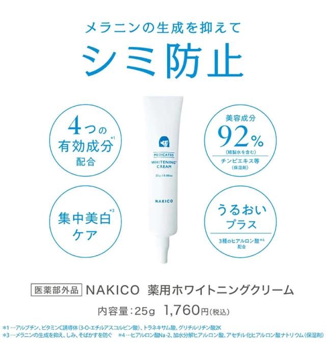 NAKICO ナキコ 薬用 ホワイトニングクリーム 25g 医薬部外品 (メール便送料無料) シミ 予防 美白 しみ そばかす 美容 クリーム スキンケア 植物由来 うるおい 保湿 アルブチン ビタミンC誘導体 トラネキサム酸 グリチルリチン酸ジカリウム