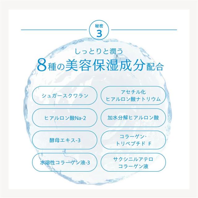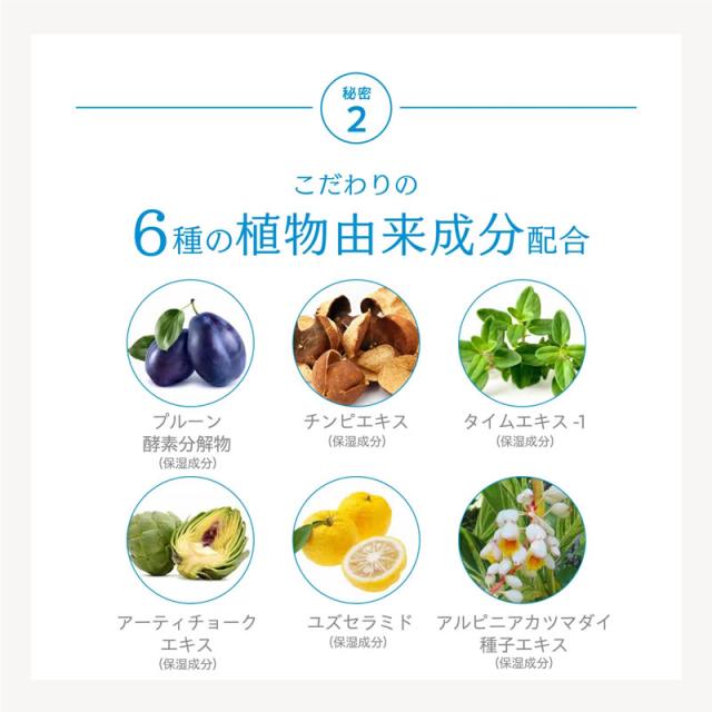 アセチル化ヒアルロン酸ナトリウム、ヒアルロン酸Na-2、加水分解ヒアルロン酸、プルーン酵素分解物、甘草エキス、センテラエキス、チンピエキス、イタドリエキス、オウゴンエキス、酵母エキス-3、茶エキス-1、コラーゲン・トリペプチドF、タイムエキス-1、カモミラエキス-1、アーティチョークエキス、ユズセラミド、マンネンロウエキス、アルピニアカツマダイ種子エキス、水溶性コラーゲン液-3、サクシニルアテロコラーゲン液、シュガースクワラン、BG、トリエチルヘキサン酸グリセリル、濃グリセリン、セタノール、ペンチレングリコール、ジメチコン、SEステアリン酸グリセリル、パルミチン酸セチル、グリコシルトレハロース・水添デンプン分解物混合溶液、ステアリン酸、グリセリンモノステアリルエーテル、ステアリン酸PEG、ステアリン酸ポリグリセリル、POEベヘニルエーテル、アラビアゴム、キサンタンガム、トリ(カプリル・カプリン酸)グリセリル、ステアロイルグルタミン酸Na、大豆リン脂質、天然ビタミンE、カラメル、ピロ亜硫酸Na、ジエチレントリアミン5酢酸5Na液、クエン酸、クエン酸Na、フェノキシエタノール